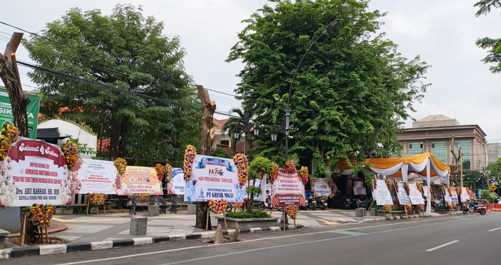 Semua karangan bunga itu ditata rapi di halaman balai KWG hingga di seberang jalan. Tampak karangan bunga dari Bupati Fandi Akhmad Yani, Wakil Bupati dr. Ashluchul Alif, Sekretaris Daerah Achmad Washil Miftahul Rachman, Kejari Gresik Zam Zam Ikhwan, DPRD Gresik. Ada juga karangan bunga dari sejumlah kepala OPD, partai politik (Parpol), serta mitra-mitra lainnya.