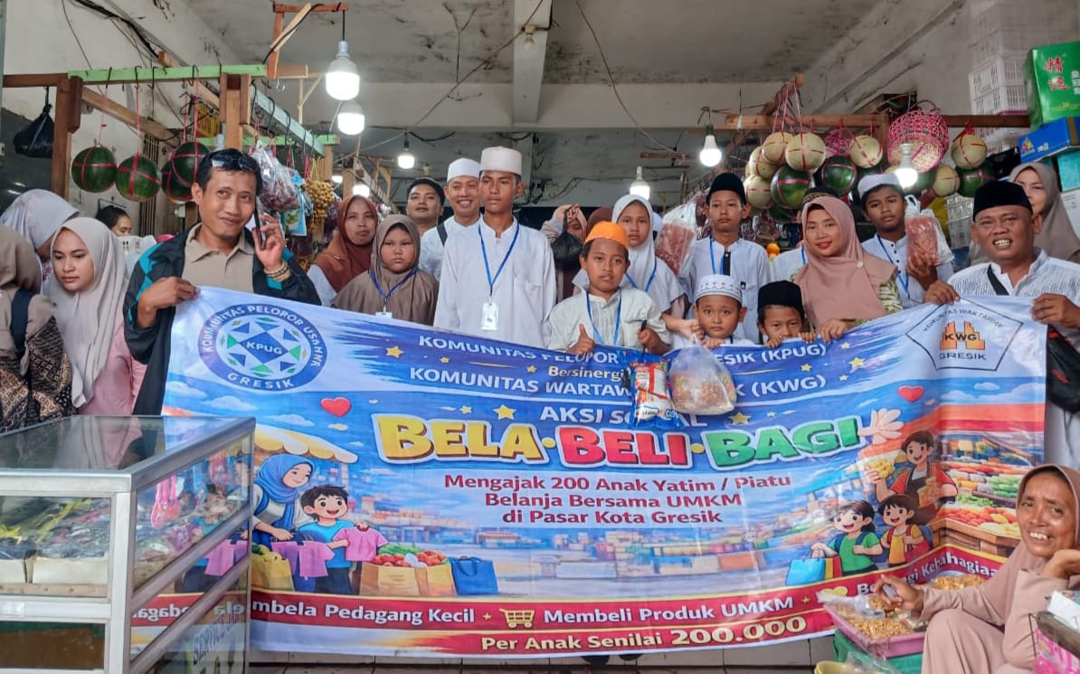 GRESIK | lampumerah.id – Berkat kolaborasi Komunitas Wartawan Gresik (KWG) dengan Komunitas Pelopor Usaha Gresik (KPUG), sebanyak 200 anak yatim bisa berbelanja sendiri kebutuhan lebaran di Pasar Gresik, Sabtu (14/3).
