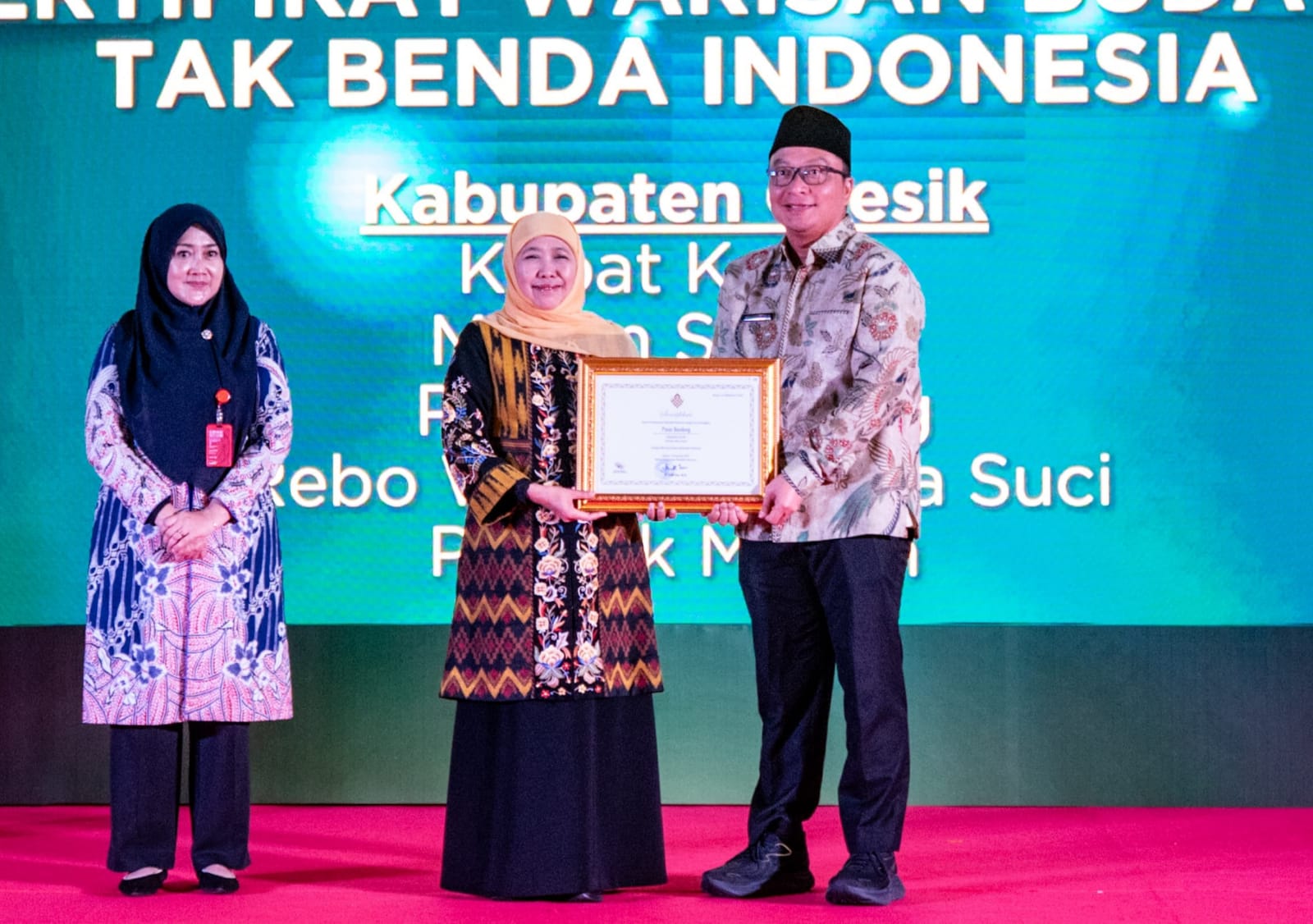 Sertifikat WBTB diserahkan langsung Gubernur Jawa Timur, Khofifah Indar Parawansa kepada Wakil Bupati Gresik, Asluchul Alif pada acara penyerahan apresiasi pelaku budaya, tambahan honorarium juru pelihara dan sertifikat WBTB di Taman Krida Budaya Kota Malang, Minggu, (22/2).