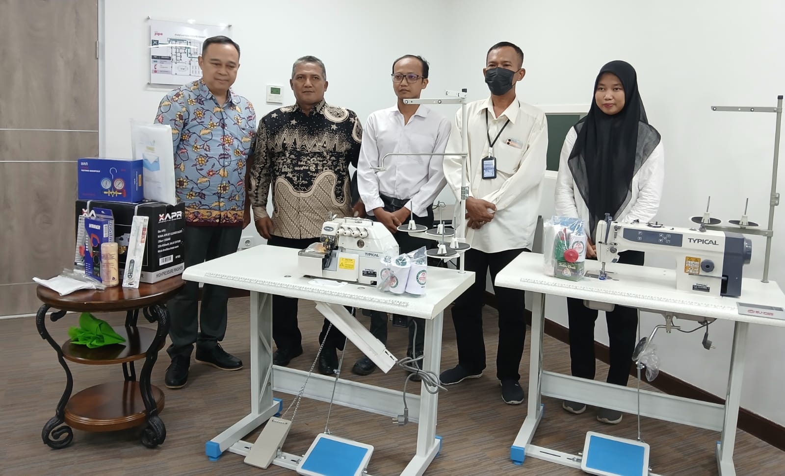 Untuk bidang menjahit, diserahkan 11 unit alat jahit yang meliputi mesin jahit lockstitch dan obras, obeng, gunting, gunting benang, benang jahit dan obras, spool, jarum jahit, plastik kemasan, sepatu jahit, sekoci, meteran, kapur jahit, hingga oli mesin.