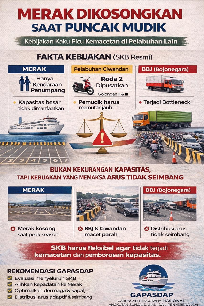 Kondisi ini, menurut GAPASDAP, memicu ketimpangan distribusi arus kendaraan di lapangan. Pelabuhan Merak mengalami kekurangan muatan, sedangkan pelabuhan penunjang justru dibebani lonjakan kendaraan hingga menimbulkan antrean panjang dan kemacetan.