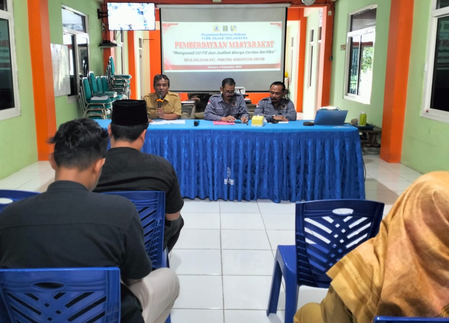 GRESIK | lampumerah.id – Yayasan Lembaga Bantuan Hukum (YLBH) Fajar Trilaksana memberikan edukasi tentang literasi hukum dan etika bermedia sosial di era digital, untuk masyarakat pesisir Desa Dalegan Kecamatan Panceng, di Balai Desa Dalegan, Selasa (4/11).