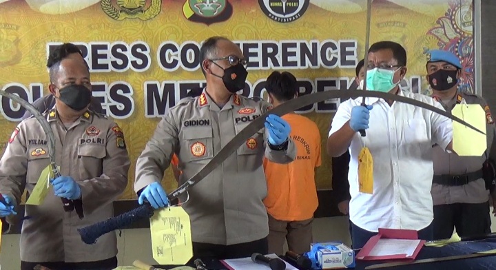 Bekasi | Lampumerah.id – Satreskrim Polres Metro Bekasi meringkus 11 pelaku tawuran pelajar berinisial AR (19), AH (18), HM (16), AR (17), MER (16), ABA (17), DF (17), DFS (17), DAK (16),SH (16), SK (15), yang melibatkan dua kelompok sekolah di Sedang Baru Bekasi, karena aksinya terekam dan viral di media sosial. HAL itu disampaikan Kapolres Metro Bekasi Kombes Pol Gidion Arif Setiyawan saat pres liris,” pada Rabu (23/2/2022).