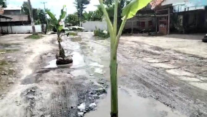 Warga kesal karena Jalan tak kunjung diperbaiki hingga akhirnya mengelar aksi tanam pisang pohon pisang ditengah jalan rusak.